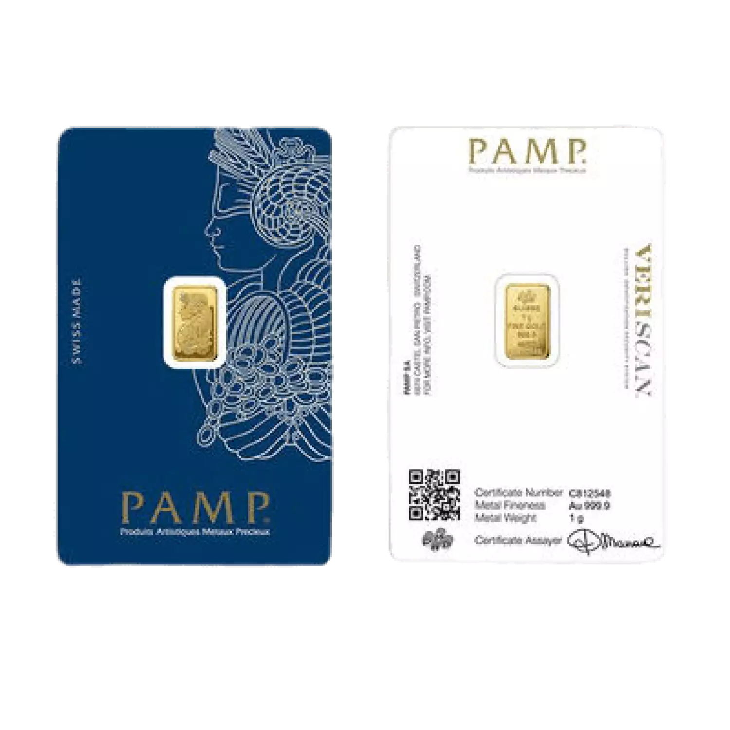 Purity: A PAMP 1 gram gold bar typically boasts a purity of .9999, or 24 karats.Design: One of the most iconic designs from PAMP is the Lady Fortuna design. Lady Fortuna, the Roman goddess of fortune, is depicted blindfolded with a cornucopia, which spills forth a bounty of riches into her hands. This intricate design showcases the artistry of PAMP Suisse's craftsmanship.