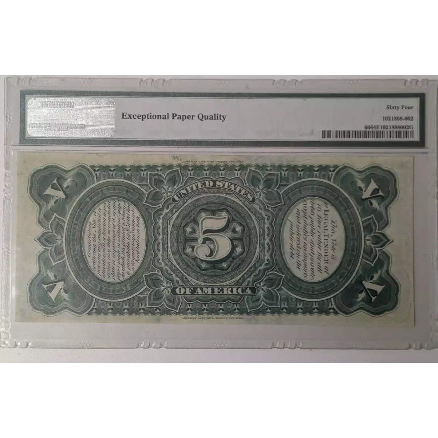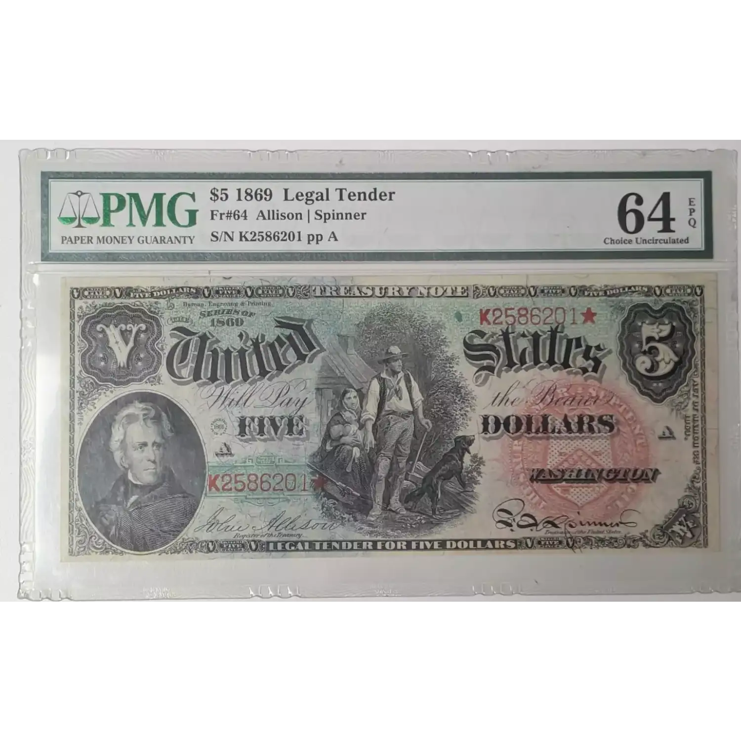1869 $5 Legal Tender Bank Note Rainbow Note - PMG 64 EPQ