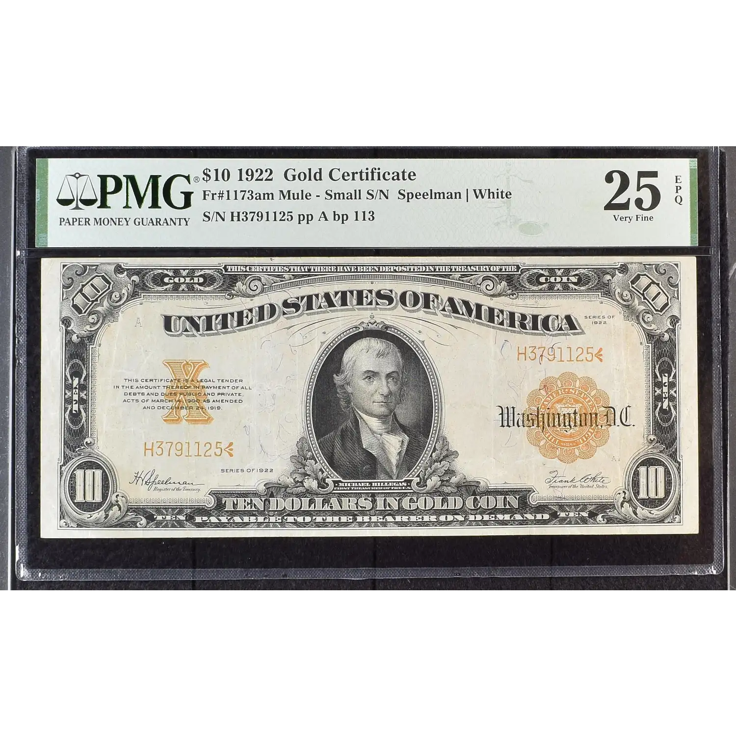 1922 $10 Gold Certificate Fr 1173am Mule Small Serial - PMG 25 EPQ